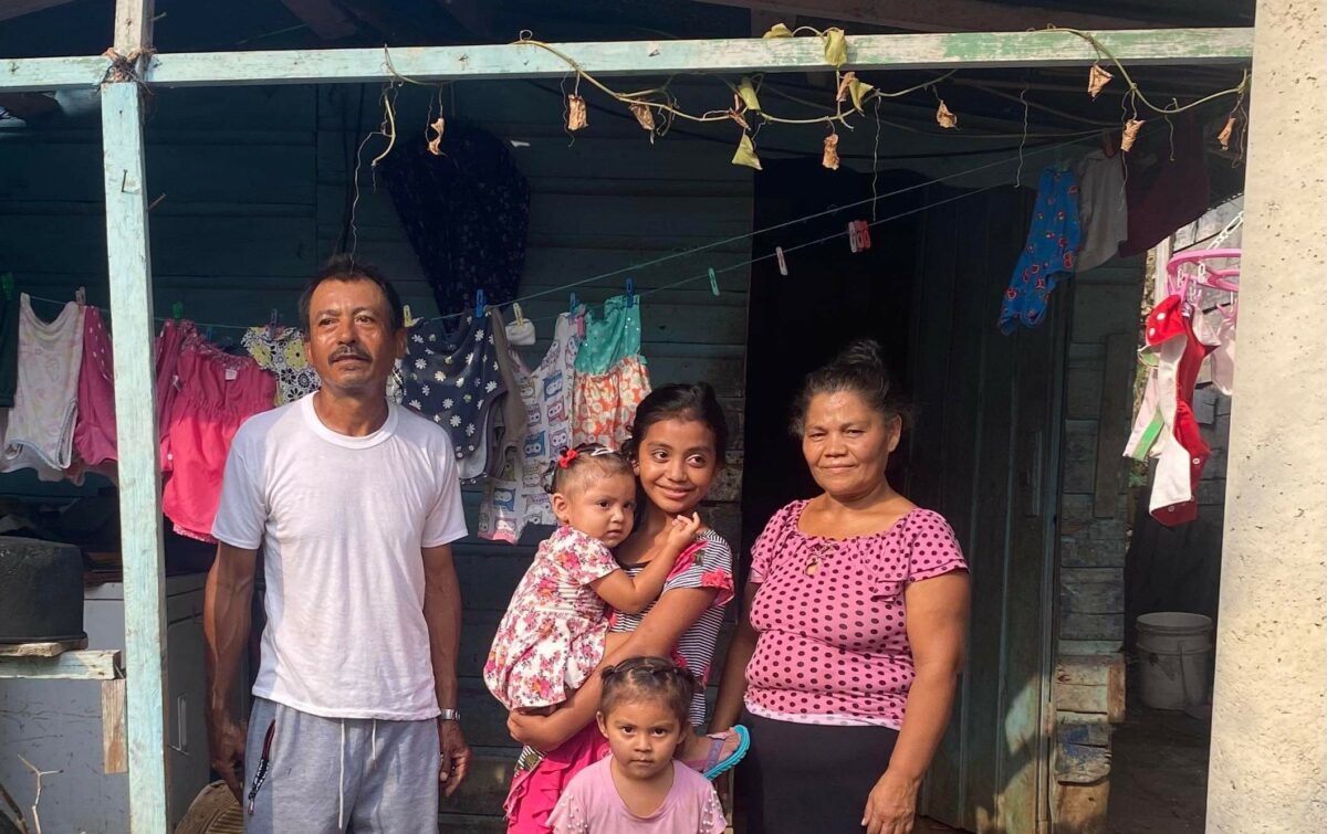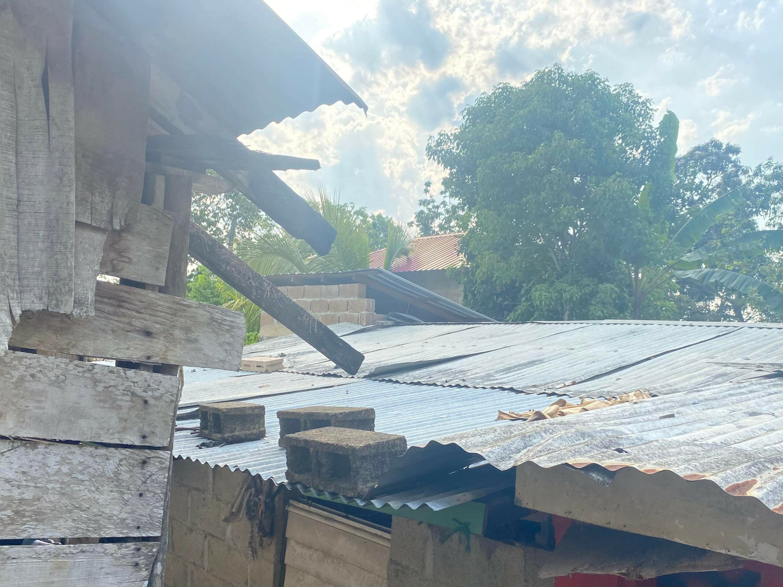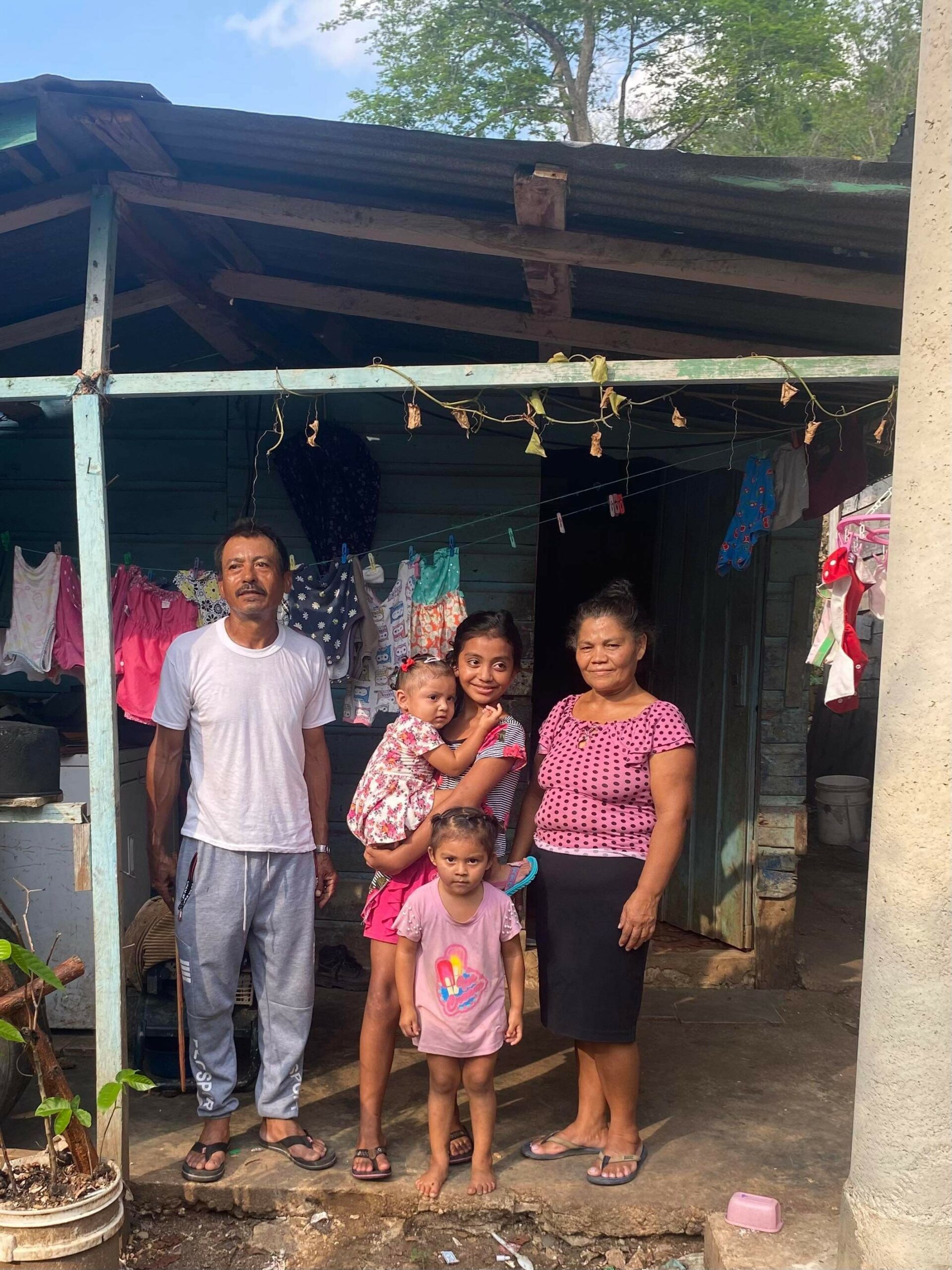 This is Catalina, Jose Alvaranga, and their family who live in Las Flores. They have requested assistance for a new roof. The current roof consists of pieces of metal, most of which is held on with cement blocks. The wood that supports the roof is mostly rotten and will be replaced with steel supports. The roof has a lot of gaps in between the metal, so when it rains, the water leaks into the house. The cost of a new roof is $3,750 U.S.