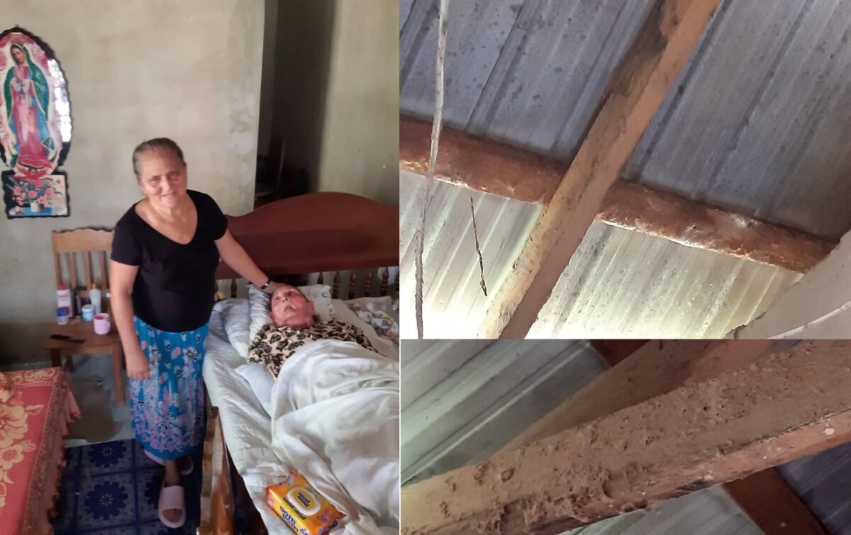 Natalia and her daughter Miriam live together in Las Flores. Natalia was married for 45 years before her husband died 22 years ago. They had 13 children together, but only three of those children are living. One child died at 23 years old in a car accident and the other 9 died when they were born. Miriam is one of the three children still living and she takes care of her mom Natalia, who is bed ridden now for 6 years from a disease that has crippled her hands, feet and legs. She has to be spoon fed and can never leave her bed. Miriam is married for 45 years and has 4 grown children. Natalia and Miriam are in need of a roof repair. You can see in the pictures that the wood in the roof was not treated and is infested with termites. The roof is unsafe, and we are asking for help to replace the bad wood with a steel frame. The estimate for the roof repair is $2,500 U.S. Will you please consider helping us replace the roof for Natalia and Miriam. Please donate below.