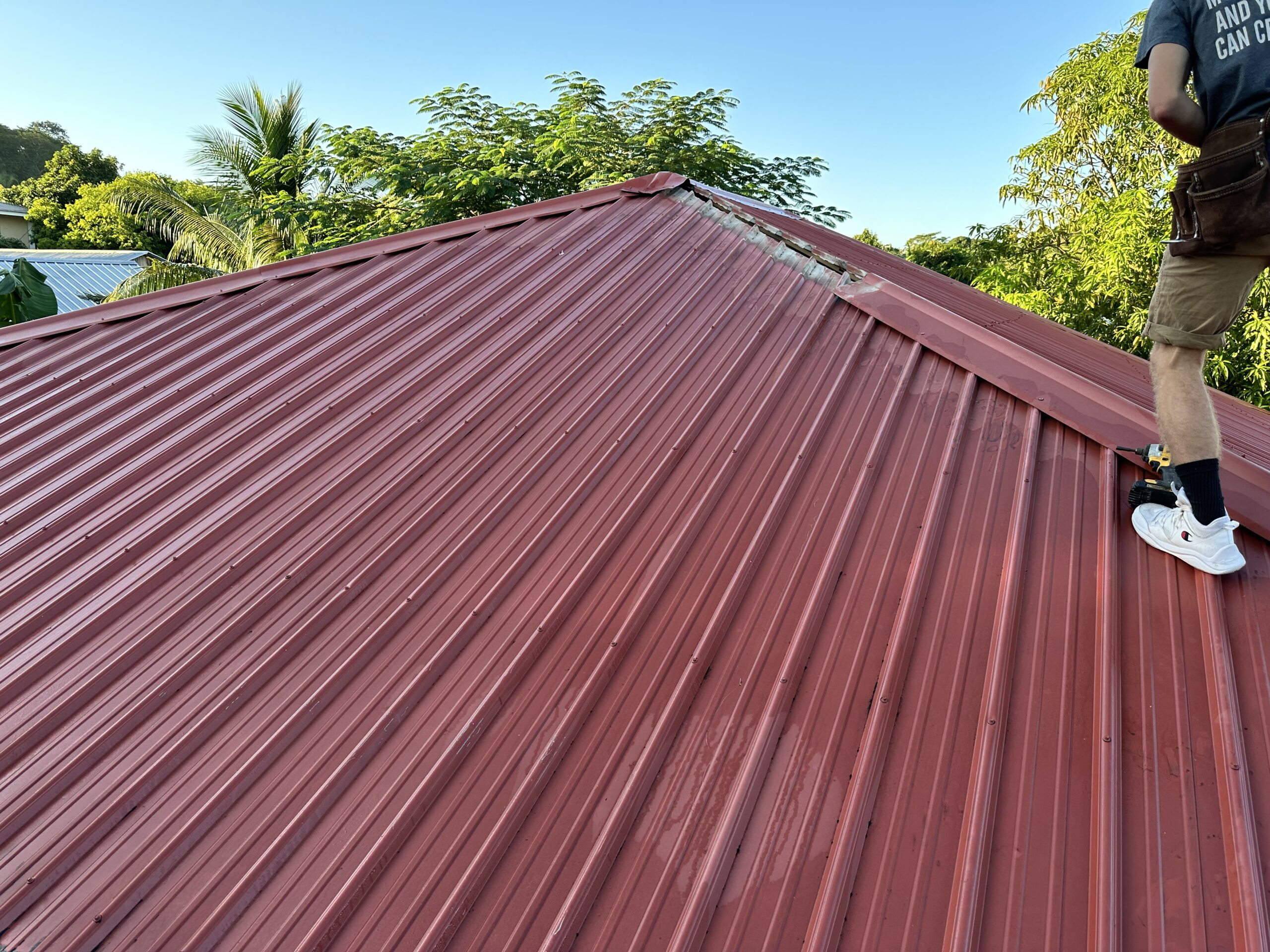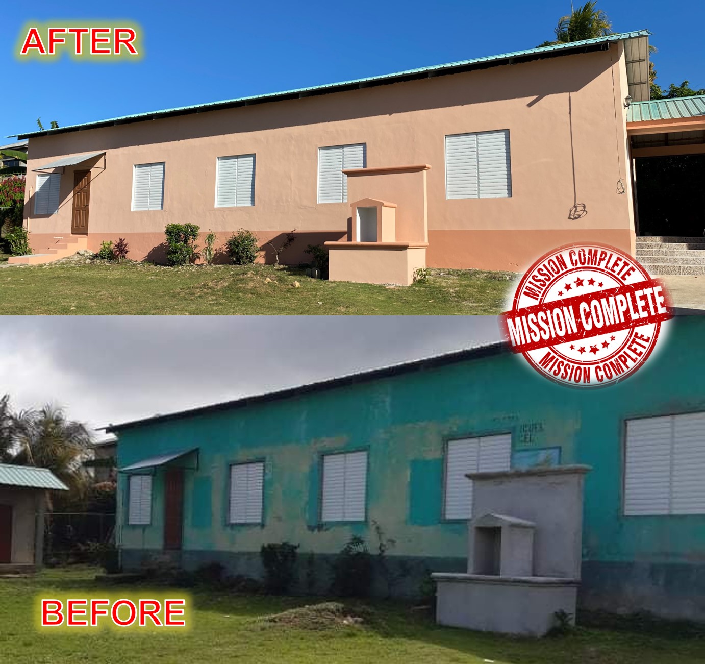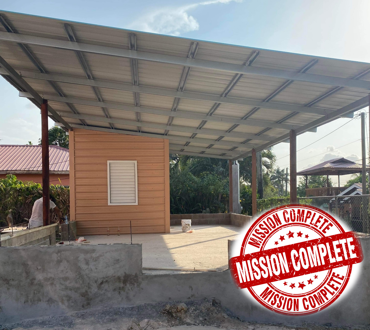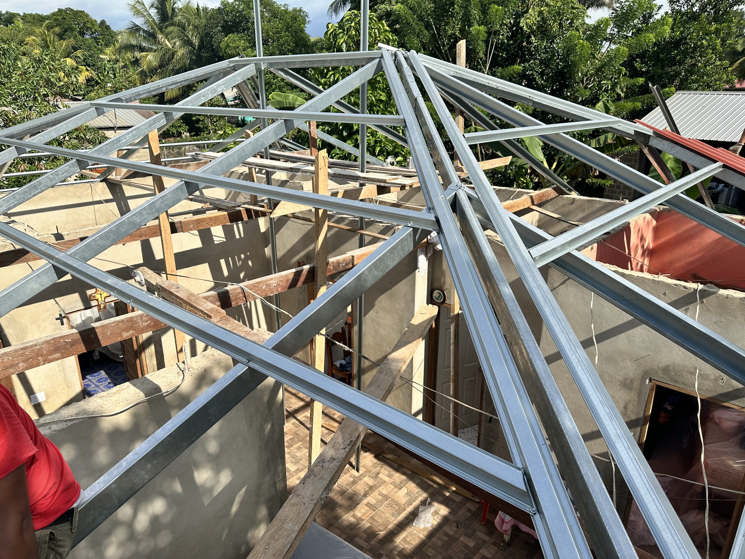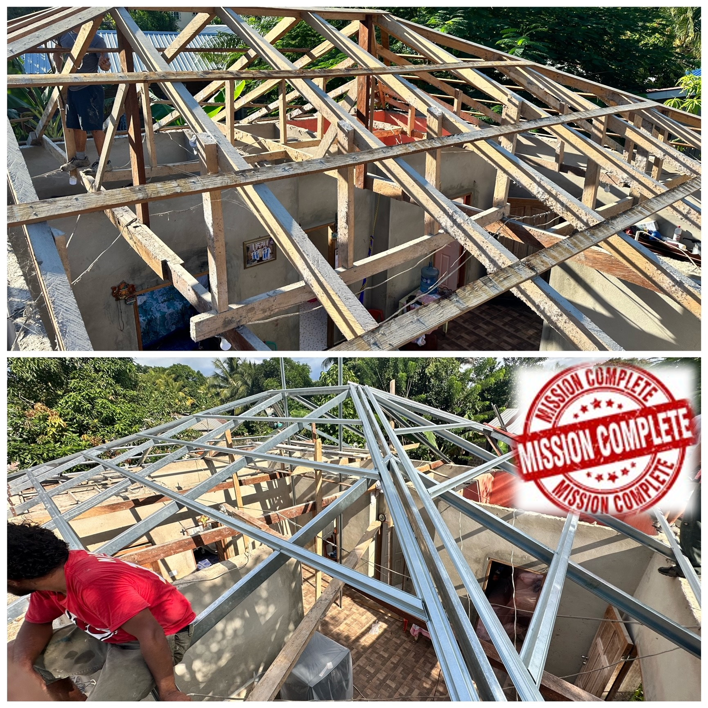 Today you see the before and after of Miriam’s Roof. Before it was a Wooden rotten roof, today it is a strong Steel Frame Roof. Mission Completed!